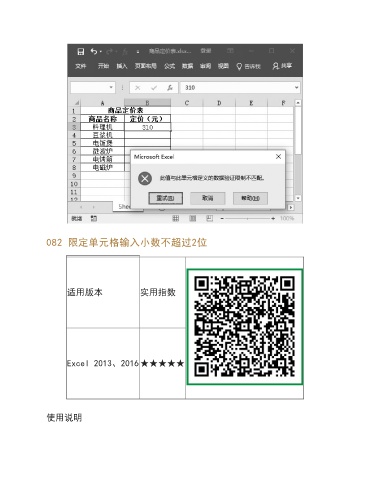 082 限定单元格输入小数不超过2位 适用版本 实用指数 Excel 2013、2016★★★★★ 使用说明