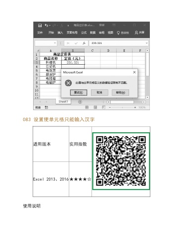 083 设置使单元格只能输入汉字 适用版本 实用指数 Excel 2013、2016★★★★☆ 使用说明