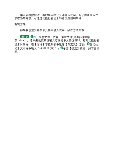 输入表格数据时,有的单元格只允许输入汉字,为了防止输入汉 字以外的内容,可通过【数据验证】功能设置限制条件。 解决方法 如果要设置只能在单元格中输入汉字,操作方法如下。 打开素材文件(位置:素材文件\第3章\采购发 票.xlsx),选中要设置数值输入范围的单元格区域B8,打开【数据验 证】对话框,在【允许】下拉列表中选择【自定义】选项; 在【公 式】文本框中输入“=ISTEXT(B8)”; 单击【确定】按钮,如下图所 示。