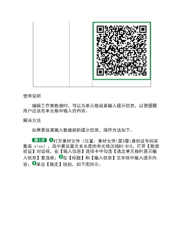 使用说明 编辑工作表数据时,可以为单元格设置输入提示信息,以便提醒 用户应该在单元格中输入的内容。 解决方法 如果要设置输入数据前的提示信息,操作方法如下。 打开素材文件(位置:素材文件\第3章\身份证号码采 集表.xlsx),选中要设置文本长度的单元格区域B3:B15,打开【数据 验证】对话框,在【输入信息】选项卡中勾选【选定单元格时显示输 入信息】复选框; 在【标题】和【输入信息】文本框中输入提示内 容; 单击【确定】按钮,如下图所示。