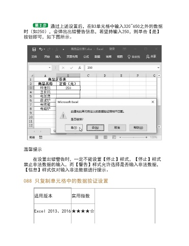 通过上述设置后,在B3单元格中输入320~650之外的数据 时(如250),会弹出出错警告信息,若坚持输入250,则单击【是】 按钮即可,如下图所示。 温馨提示 在设置出错警告时,一定不能设置【停止】样式,【停止】样式 禁止非法数据的输入,而【警告】样式允许选择是否输入非法数据, 【信息】样式仅对输入非法数据进行提示。 088 只复制单元格中的数据验证设置 适用版本 实用指数 Excel 2013、2016★★★★☆