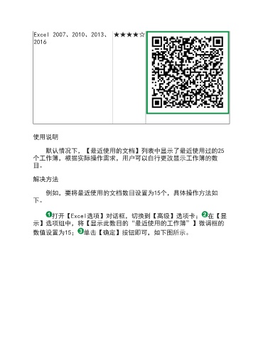 Excel 2007、2010、2013、 ★★★★☆ 2016 使用说明 默认情况下,【最近使用的文档】列表中显示了最近使用过的25 个工作簿,根据实际操作需求,用户可以自行更改显示工作簿的数 目。 解决方法 例如,要将最近使用的文档数目设置为15个,具体操作方法如 下。 打开【Excel选项】对话框,切换到【高级】选项卡; 在【显 示】选项组中,将【显示此数目的“最近使用的工作簿”】微调框的 数值设置为15; 单击【确定】按钮即可,如下图所示。