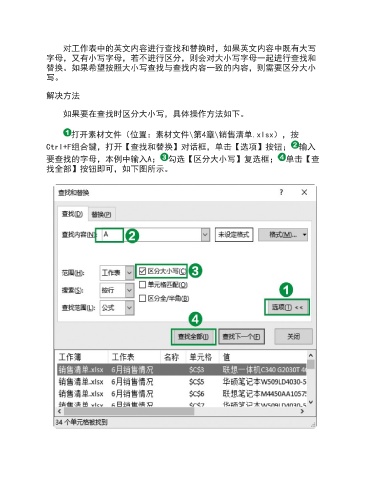 对工作表中的英文内容进行查找和替换时,如果英文内容中既有大写 字母,又有小写字母,若不进行区分,则会对大小写字母一起进行查找和 替换。如果希望按照大小写查找与查找内容一致的内容,则需要区分大小 写。 解决方法 如果要在查找时区分大小写,具体操作方法如下。 打开素材文件(位置:素材文件\第4章\销售清单.xlsx),按 Ctrl+F组合键,打开【查找和替换】对话框,单击【选项】按钮; 输入 要查找的字母,本例中输入A; 勾选【区分大小写】复选框; 单击【查 找全部】按钮即可,如下图所示。