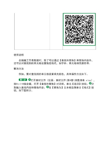使用说明 在编辑工作表数据时,除了可以通过【查找和替换】来替换内容外, 还可以对查找到的单元格设置指定格式,如字体、单元格填充颜色等。 解决方法 例如,要对查找到的单元格设置填充颜色,具体操作方法如下。 打开素材文件(位置:素材文件\第4章\销售清单.xlsx), 按Ctrl+H组合键,打开【查找和替换】对话框,单击【选项】按钮; 分 别输入查找内容和替换内容; 在【替换为】文本框右侧单击【格式】按 钮,如下图所示。