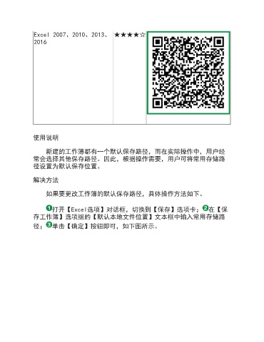 Excel 2007、2010、2013、 ★★★★☆ 2016 使用说明 新建的工作簿都有一个默认保存路径,而在实际操作中,用户经 常会选择其他保存路径。因此,根据操作需要,用户可将常用存储路 径设置为默认保存位置。 解决方法 如果要更改工作簿的默认保存路径,具体操作方法如下。 打开【Excel选项】对话框,切换到【保存】选项卡; 在【保 存工作簿】选项组的【默认本地文件位置】文本框中输入常用存储路 径; 单击【确定】按钮即可,如下图所示。