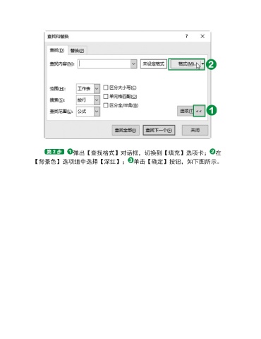 弹出【查找格式】对话框,切换到【填充】选项卡; 在 【背景色】选项组中选择【深红】; 单击【确定】按钮,如下图所示。