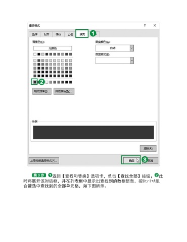 返回【查找和替换】选项卡,单击【查找全部】按钮; 此 时将展开该对话框,并在列表框中显示出查找到的数据信息,按Ctrl+A组 合键选中查找到的全部单元格,如下图所示。