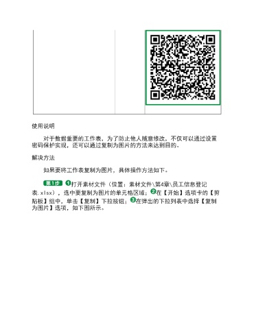使用说明 对于数据重要的工作表,为了防止他人随意修改,不仅可以通过设置 密码保护实现,还可以通过复制为图片的方法来达到目的。 解决方法 如果要将工作表复制为图片,具体操作方法如下。 打开素材文件(位置:素材文件\第4章\员工信息登记 表.xlsx),选中要复制为图片的单元格区域; 在【开始】选项卡的【剪 贴板】组中,单击【复制】下拉按钮; 在弹出的下拉列表中选择【复制 为图片】选项,如下图所示。