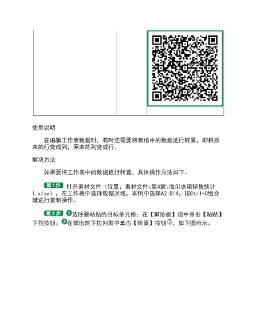 使用说明 在编辑工作表数据时,有时还需要将表格中的数据进行转置,即将原 来的行变成列,原来的列变成行。 解决方法 如果要将工作表中的数据进行转置,具体操作方法如下。 打开素材文件(位置:素材文件\第4章\海尔冰箱销售统计 1.xlsx),在工作表中选择数据区域,本例中选择A2:D14,按Ctrl+C组合 键进行复制操作。 选择要粘贴的目标单元格;在【剪贴板】组中单击【粘贴】 下拉按钮; 在弹出的下拉列表中单击【转置】按钮 ,如下图所示。