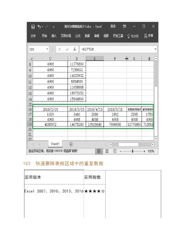102 快速删除表格区域中的重复数据 适用版本 实用指数 Excel 2007、2010、2013、2016★★★★☆