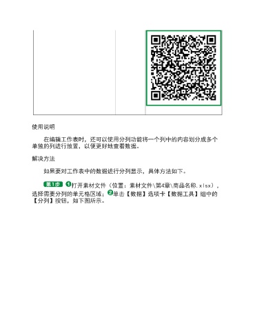 使用说明 在编辑工作表时,还可以使用分列功能将一个列中的内容划分成多个 单独的列进行放置,以便更好地查看数据。 解决方法 如果要对工作表中的数据进行分列显示,具体方法如下。 打开素材文件(位置:素材文件\第4章\商品名称.xlsx), 选择需要分列的单元格区域; 单击【数据】选项卡【数据工具】组中的 【分列】按钮,如下图所示。