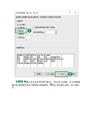 弹出【文本分列向导-第3步,共3步】对话框,在【列数据 格式】选项组中选中【常规】单选按钮; 单击【完成】按钮,如下图所 示。