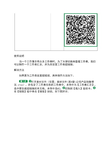 使用说明 当一个工作簿含有众多工作表时,为了方便切换和查看工作表,我们 可以制作一个工作表汇总,并为其设置工作表超链接。 解决方法 如果要为工作表设置超链接,具体操作方法如下。 打开素材文件(位置:素材文件\第4章\公司产品销售情 况.xlsx),在包含了工作表名称的工作表中,本例中为【工作表汇总】, 选中要创建超链接的单元格,本例中选A2; 切换到【插入】选项卡; 在【链接】组中单击【链接】按钮,如下图所示。