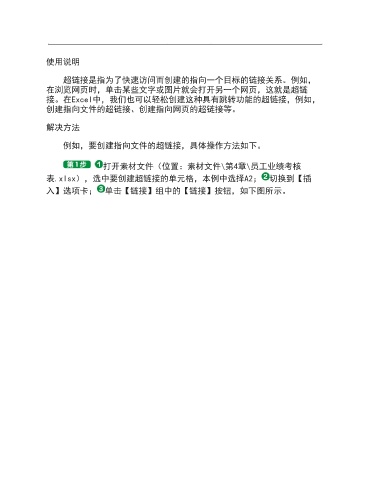 使用说明 超链接是指为了快速访问而创建的指向一个目标的链接关系。例如, 在浏览网页时,单击某些文字或图片就会打开另一个网页,这就是超链 接。在Excel中,我们也可以轻松创建这种具有跳转功能的超链接,例如, 创建指向文件的超链接、创建指向网页的超链接等。 解决方法 例如,要创建指向文件的超链接,具体操作方法如下。 打开素材文件(位置:素材文件\第4章\员工业绩考核 表.xlsx),选中要创建超链接的单元格,本例中选择A2; 切换到【插 入】选项卡; 单击【链接】组中的【链接】按钮,如下图所示。