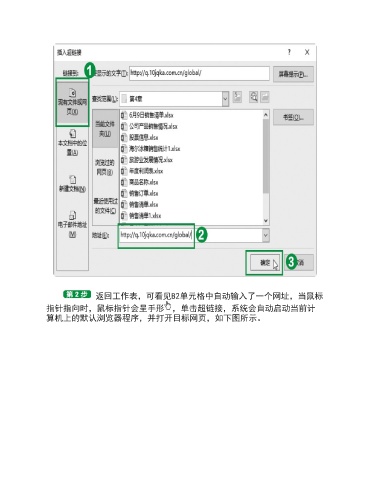 返回工作表,可看见B2单元格中自动输入了一个网址,当鼠标 指针指向时,鼠标指针会呈手形 ,单击超链接,系统会自动启动当前计 算机上的默认浏览器程序,并打开目标网页,如下图所示。