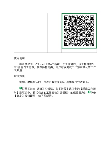 使用说明 默认情况下,在Excel 2016中新建一个工作簿后,该工作簿中只 有1张空白工作表,根据操作需要,用户可以更改工作簿中默认的工作 表数量。 解决方法 例如,要将默认的工作表张数设置为5,具体操作方法如下。 打开【Excel选项】对话框,在【常规】选项卡的【新建工作簿 时】选项组中,将【包含的工作表数】微调框中的值设置为5; 单击 【确定】按钮即可,如下图所示。