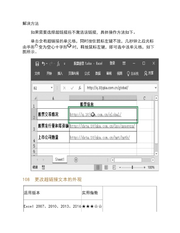 解决方法 如果需要选择超链接后不激活该链接,具体操作方法如下。 单击含有超链接的单元格,同时按住鼠标左键不放,几秒钟之后光标 由手形 变为空心十字形 时,释放鼠标左键,即可选中该单元格,如下 图所示。 108 更改超链接文本的外观 适用版本 实用指数 Excel 2007、2010、2013、2016★★★☆☆