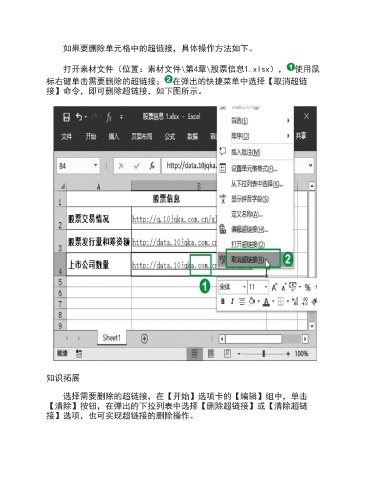 如果要删除单元格中的超链接,具体操作方法如下。 打开素材文件(位置:素材文件\第4章\股票信息1.xlsx), 使用鼠 标右键单击需要删除的超链接; 在弹出的快捷菜单中选择【取消超链 接】命令,即可删除超链接,如下图所示。 知识拓展 选择需要删除的超链接,在【开始】选项卡的【编辑】组中,单击 【清除】按钮,在弹出的下拉列表中选择【删除超链接】或【清除超链 接】选项,也可实现超链接的删除操作。