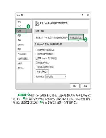 弹出【自动更正】对话框,切换到【键入时自动套用格式】 选项卡; 在【键入时替换】选项组中,取消勾选【Internet及网络路径 替换为超链接】复选框; 单击【确定】按钮,如下图所示。