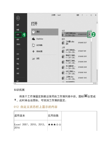 知识拓展 将某个工作簿固定到最近使用的工作簿列表中后,图标 会变成 ,此时单击该图标,可取消工作簿的固定。 012 自定义状态栏上显示的内容 适用版本 实用指数 Excel 2007、2010、2013、 ★★★☆☆ 2016