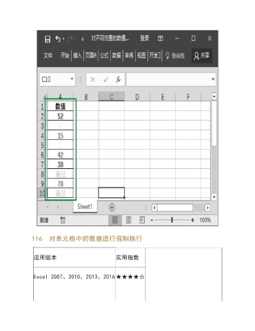 116 对单元格中的数据进行强制换行 适用版本 实用指数 Excel 2007、2010、2013、2016★★★★☆