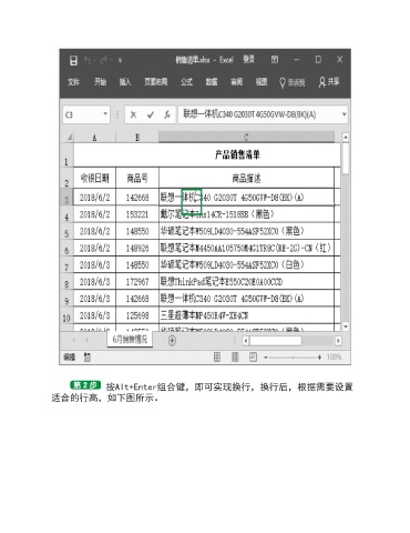 按Alt+Enter组合键,即可实现换行,换行后,根据需要设置 适合的行高,如下图所示。