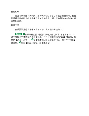 使用说明 在单元格中输入内容时,有时内容的长度会大于单元格的宽度。如果 不想通过调整列宽的方式来显示单元格内容,则可以使用缩小字体填充单 元格的方法。 解决方法 如果要设置缩小字体填充单元格,具体操作方法如下。 打开素材文件(位置:素材文件\第5章\销售清单.xlsx), 选中要缩小字体填充的单元格区域,打开【设置单元格格式】对话框;切 换到【对齐】选项卡; 在【文本控制】选项组中勾选【缩小字体填充】 复选框; 单击【确定】按钮,如下图所示。