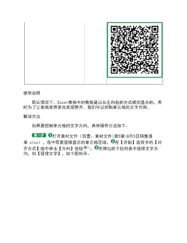 使用说明 默认情况下,Excel表格中的数据是以从左向右的方式横排显示的,有 时为了让表格变得更加美观整齐,我们可以控制单元格的文字方向。 解决方法 如果要控制单元格的文字方向,具体操作方法如下。 打开素材文件(位置:素材文件\第5章\8月5日销售清 单.xlsx),选中需要竖排显示的单元格区域; 在【开始】选项卡的【对 齐方式】组中单击【方向】按钮 ; 在弹出的下拉列表中选择文字方 向,如【竖排文字】,如下图所示。