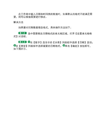 在工作表中输入日期和时间类的数据时,如果默认的格式不能满足需 要,则可以根据需要进行修改。 解决方法 如果要对日期数据修改格式,具体操作方法如下。 选中需要修改日期格式的单元格区域,打开【设置单元格格 式】对话框。 在【数字】选项卡的【分类】列表框中选择【日期】选项; 在【类型】列表框中选择需要的日期格式; 单击【确定】按钮即可, 如下图所示。