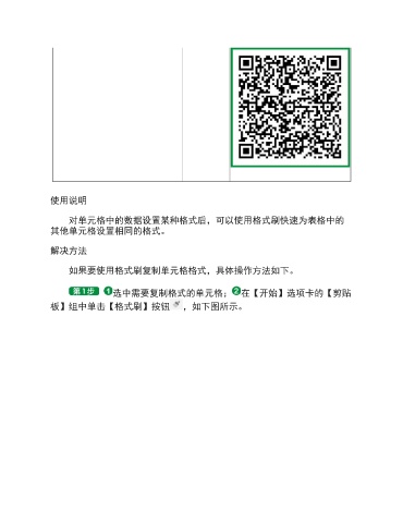 使用说明 对单元格中的数据设置某种格式后,可以使用格式刷快速为表格中的 其他单元格设置相同的格式。 解决方法 如果要使用格式刷复制单元格格式,具体操作方法如下。 选中需要复制格式的单元格; 在【开始】选项卡的【剪贴 板】组中单击【格式刷】按钮 ,如下图所示。