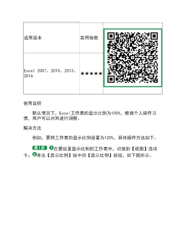 适用版本 实用指数 Excel 2007、2010、2013、 2016 ★★★★★ 使用说明 默认情况下,Excel工作表的显示比例为100%,根据个人操作习 惯,用户可以对其进行调整。 解决方法 例如,要将工作表的显示比例设置为120%,具体操作方法如下。 在要设置显示比例的工作表中,切换到【视图】选项 卡; 单击【显示比例】组中的【显示比例】按钮,如下图所示。