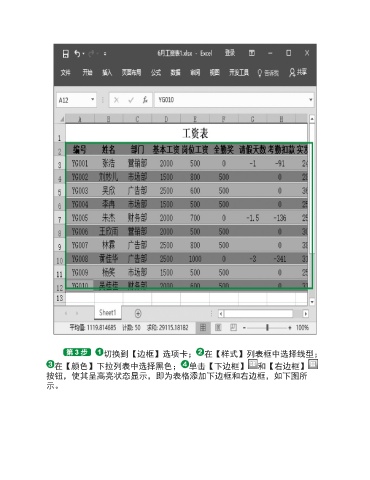 切换到【边框】选项卡; 在【样式】列表框中选择线型; 在【颜色】下拉列表中选择黑色; 单击【下边框】 和【右边框】 按钮,使其呈高亮状态显示,即为表格添加下边框和右边框,如下图所 示。