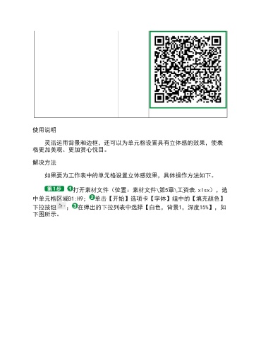 使用说明 灵活运用背景和边框,还可以为单元格设置具有立体感的效果,使表 格更加美观、更加赏心悦目。 解决方法 如果要为工作表中的单元格设置立体感效果,具体操作方法如下。 打开素材文件(位置:素材文件\第5章\工资表.xlsx),选 中单元格区域B1:H9; 单击【开始】选项卡【字体】组中的【填充颜色】 下拉按钮 ; 在弹出的下拉列表中选择【白色,背景1,深度15%】,如 下图所示。