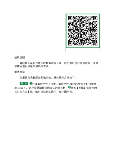 使用说明 斜线表头是制作表头时最常用的元素,我们可以选择手动绘制,也可 以使用边框快速添加斜线表头。 解决方法 如果要为表格添加斜线表头,具体操作方法如下。 打开素材文件(位置:素材文件\第5章\智能手机销售情 况.xlsx),选中需要制作斜线表头的单元格; 单击【开始】选项卡的 【对齐方式】组中的对话框启动器 ,如下图所示。