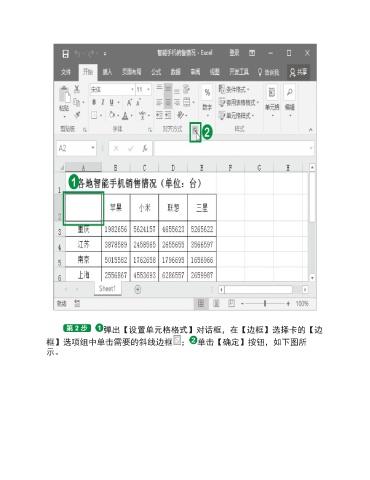 弹出【设置单元格格式】对话框,在【边框】选择卡的【边 框】选项组中单击需要的斜线边框 ; 单击【确定】按钮,如下图所 示。