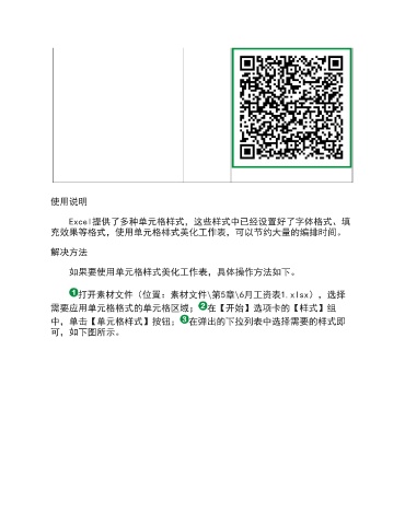 使用说明 Excel提供了多种单元格样式,这些样式中已经设置好了字体格式、填 充效果等格式,使用单元格样式美化工作表,可以节约大量的编排时间。 解决方法 如果要使用单元格样式美化工作表,具体操作方法如下。 打开素材文件(位置:素材文件\第5章\6月工资表1.xlsx),选择 需要应用单元格格式的单元格区域; 在【开始】选项卡的【样式】组 中,单击【单元格样式】按钮; 在弹出的下拉列表中选择需要的样式即 可,如下图所示。