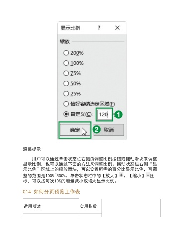 温馨提示 用户可以通过单击状态栏右侧的调整比例按钮或拖动滑块来调整 显示比例,也可以通过下面的方法来调整比例。拖动状态栏右侧“显 示比例”区域上的缩放滑块,可以设置所需的百分比显示比例,可调 整的范围是100%~500%。单击状态栏中的【放大】 、【缩小】 图 标,可以按每次10%的增量减小或增大显示比例。 014 如何分页预览工作表 适用版本 实用指数