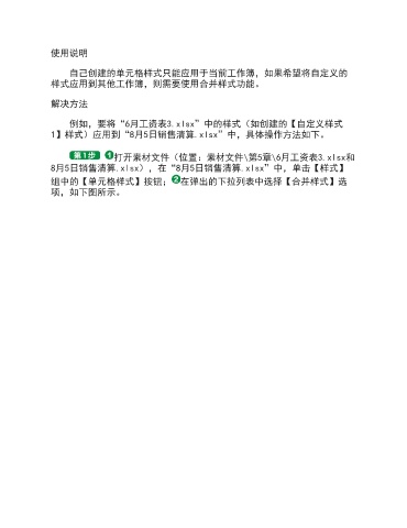 使用说明 自己创建的单元格样式只能应用于当前工作簿,如果希望将自定义的 样式应用到其他工作簿,则需要使用合并样式功能。 解决方法 例如,要将“6月工资表3.xlsx”中的样式(如创建的【自定义样式 1】样式)应用到“8月5日销售清算.xlsx”中,具体操作方法如下。 打开素材文件(位置:素材文件\第5章\6月工资表3.xlsx和 8月5日销售清算.xlsx),在“8月5日销售清算.xlsx”中,单击【样式】 组中的【单元格样式】按钮; 在弹出的下拉列表中选择【合并样式】选 项,如下图所示。