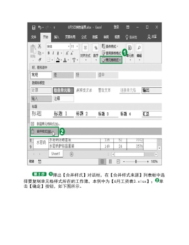 弹出【合并样式】对话框,在【合并样式来源】列表框中选 择要复制单元格样式所在的工作簿,本例中为【6月工资表3.xlsx】; 单 击【确定】按钮,如下图所示。