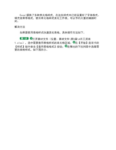 Excel提供了多种单元格样式,在这些样式中已经设置好了字体格式、 填充效果等格式,使用单元格样式美化工作表,可以节约大量的编排时 间。 解决方法 如果要使用表格样式快速美化表格,具体操作方法如下。 打开素材文件(位置:素材文件\第5章\6月工资表 1.xlsx),选中需要套用表格样式的单元格区域; 在【开始】选项卡的 【样式】组中单击【套用表格格式】按钮; 在弹出的下拉列表中选择需 要的表格样式,如下图所示。