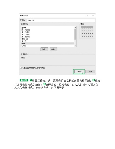 返回工作表,选中需要套用表格样式的单元格区域; 单击 【套用表格格式】按钮; 在弹出的下拉列表的【自定义】栏中可看到自 定义的表格样式,单击该样式,如下图所示。