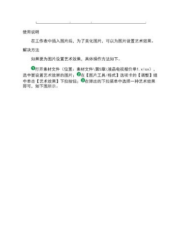 使用说明 在工作表中插入图片后,为了美化图片,可以为图片设置艺术效果。 解决方法 如果要为图片设置艺术效果,具体操作方法如下。 打开素材文件(位置:素材文件\第5章\液晶电视报价单1.xlsx), 选中要设置艺术效果的图片; 在【图片工具/格式】选项卡的【调整】组 中单击【艺术效果】下拉按钮; 在弹出的下拉菜单中选择一种艺术效果 即可,如下图所示。