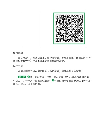 使用说明 默认情况下,图片会随单元格改变位置,如果有需要,也可以将图片 固定位置和大小,使其不随单元格的移动而改变。 解决方法 如果要在单元格中固定图片大小及位置,具体操作方法如下。 打开素材文件(位置:素材文件\第5章\液晶电视报价单 1.xlsx),在图片上单击鼠标右键; 在弹出的快捷菜单中选择【大小和 属性】命令,如下图所示。