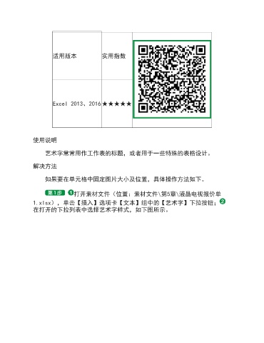 适用版本 实用指数 Excel 2013、2016 ★★★★★ 使用说明 艺术字常常用作工作表的标题,或者用于一些特殊的表格设计。 解决方法 如果要在单元格中固定图片大小及位置,具体操作方法如下。 打开素材文件(位置:素材文件\第5章\液晶电视报价单 1.xlsx),单击【插入】选项卡【文本】组中的【艺术字】下拉按钮; 在打开的下拉列表中选择艺术字样式,如下图所示。