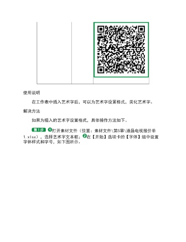 使用说明 在工作表中插入艺术字后,可以为艺术字设置格式,美化艺术字。 解决方法 如果为插入的艺术字设置格式,具体操作方法如下。 打开素材文件(位置:素材文件\第5章\液晶电视报价单 1.xlsx),选择艺术字文本框; 在【开始】选项卡的【字体】组中设置 字体样式和字号,如下图所示。