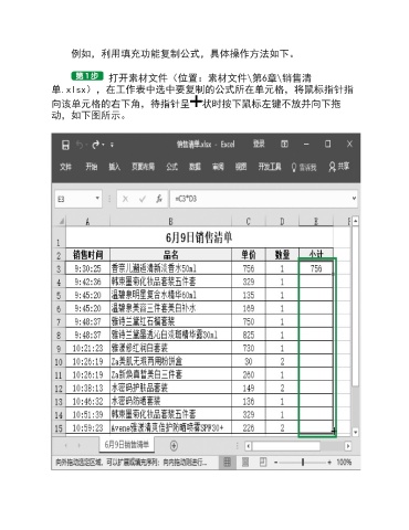例如,利用填充功能复制公式,具体操作方法如下。 打开素材文件(位置:素材文件\第6章\销售清 单.xlsx),在工作表中选中要复制的公式所在单元格,将鼠标指针指 向该单元格的右下角,待指针呈 状时按下鼠标左键不放并向下拖 动,如下图所示。