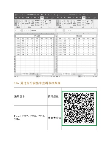 016 通过拆分窗格来查看表格数据 适用版本 实用指数 Excel 2007、2010、2013、 2016 ★★★☆☆