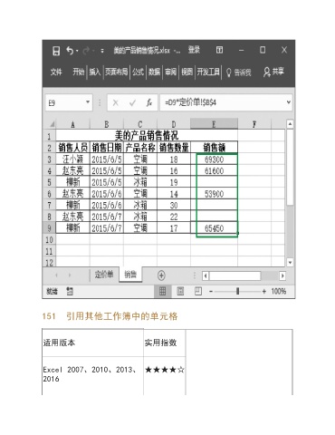 151 引用其他工作簿中的单元格 适用版本 实用指数 Excel 2007、2010、2013、 ★★★★☆ 2016