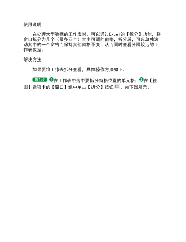 使用说明 在处理大型数据的工作表时,可以通过Excel的【拆分】功能,将 窗口拆分为几个(最多四个)大小可调的窗格,拆分后,可以单独滚 动其中的一个窗格而保持其他窗格不变,从而同时查看分隔较远的工 作表数据。 解决方法 如果要将工作表拆分查看,具体操作方法如下。 在工作表中选中要拆分窗格位置的单元格; 在【视 图】选项卡的【窗口】组中单击【拆分】按钮 ,如下图所示。