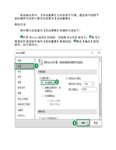 在实际应用中,【手动重算】方式非常不方便,建议用户按照下 面的操作方法将计算方式设置为【自动重算】。 解决方法 将计算方式设置为【自动重算】的操作方法如下。 打开【Excel选项】对话框,切换到【公式】选项卡; 在【计 算选项】选项组中选中【自动重算】单选按钮; 单击【确定】按钮 即可,如下图所示。